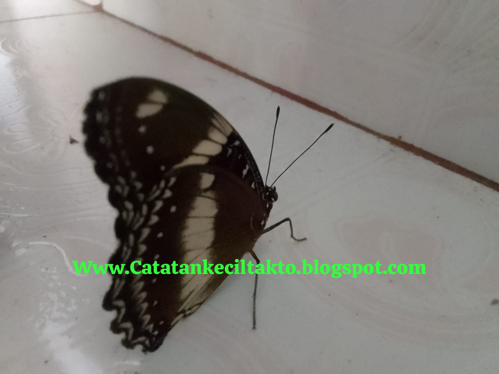 Hari ini ada hal yang membuat saya terkejut, tiba-tiba saya lihat di depan pintu kamar adik saya ada seekor kupu-kupu berwarna ke coklatan berdiri mematung, lalu saya hampiri karna keadaan rumah saat itu sepi sekitar pukul 08.00 pagi , jadi mungkin tidak ada yang menyadari bahwa di sini ada kupu-kupu.